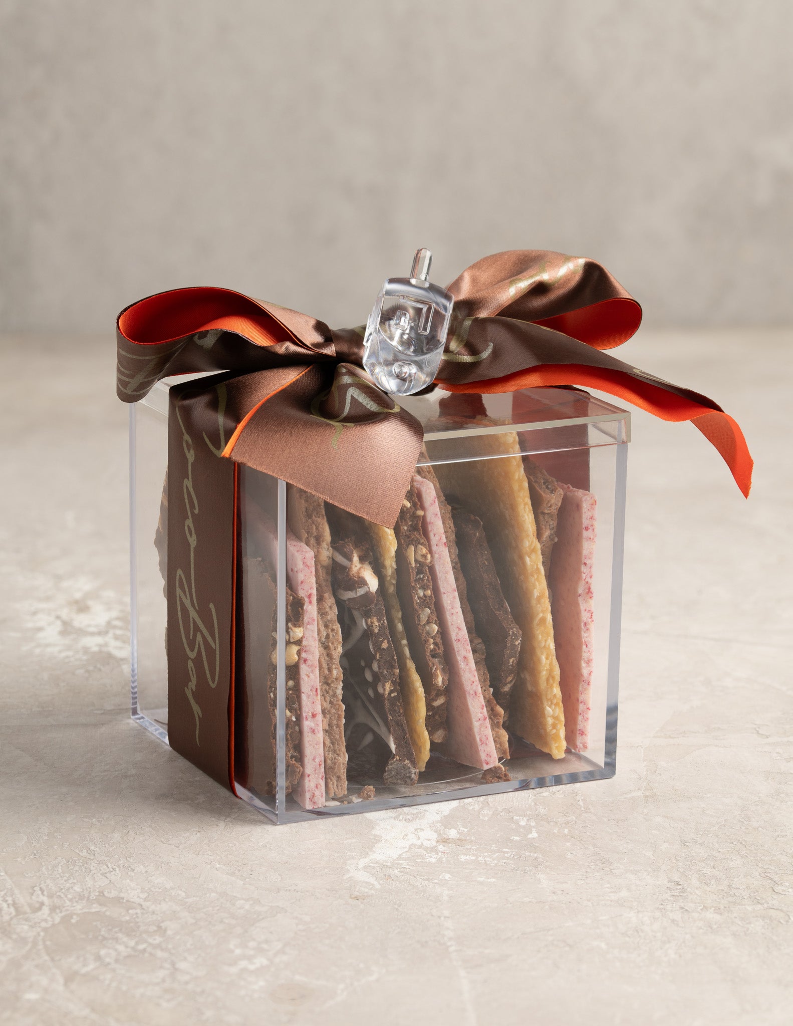 Lucite cube filled with bark chunks of strawberry crush, marshmallow blast, sesame brittle, Krispy bark Includes 1 piece.