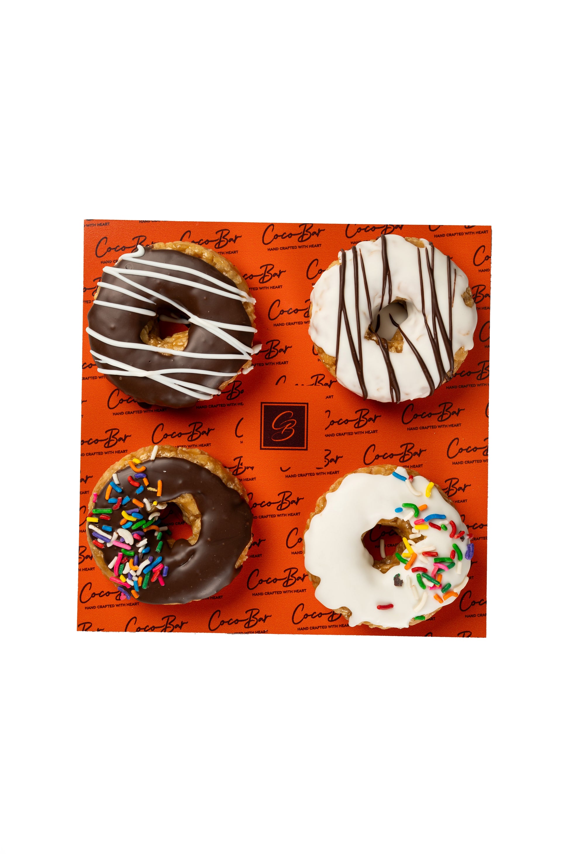 4 peanut chew donuts peanut chew glazed in white and dark chocolate, topped with rainbow sprinkles.